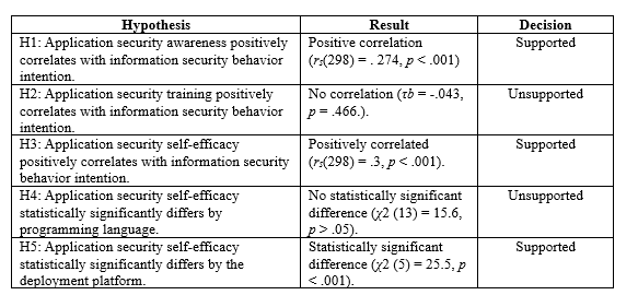 Application security awareness (rs(298) = . 274, p < .001) and application security self-efficacy (rs(298) = .3, p < .001) positively correlated with information security behavior intention, while application security training (τb = -.043, p = .466) did not. Based on the result, Hypotheses One and Three were supported, while Hypothesis Two was unsupported. Application security self-efficacy statistically significantly differed by the deployment platform (χ2 (5) = 25.5, p < .001) but not by programming language (χ2 (13) = 15.6, p > .05). Hypothesis Five was, therefore,