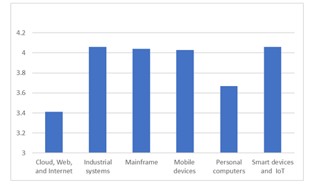 Table 5 shows the developer application security self-efficacy descriptives for each deployment platform group. Developers that deployed applications for industrial systems and IoT had the highest reported mean application security self-efficacy score of 4.06. Developers who deployed to the cloud, web, and internet (CWI) and personal computers had the lowest reported application security self-efficacy, with mean scores of 3.41 and 3.67, respectively. Figure 2 graphically depicts the self-efficacy scores by deployment platform.