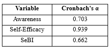 The scales for awareness, self-efficacy, and SeBI were all tested for reliability using Cronbach’s alpha. All scales had good Cronbach alpha scores above 0.6. Table 2 summarizes the Cronbach alpha scores of the measurement scales