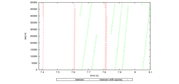 From Figure 10, The RED ‘+’ marking shows the time segments that were transmitted using newCWV, and the GREEN ‘x’ marks shows the same for newCWV with pacing enabled. The gradient of the segments v. time confirms that with pacing the segments were transmitted over a period of the order of an RTT rather than as an abrupt injection of data using only newCWV (vertical RED line).