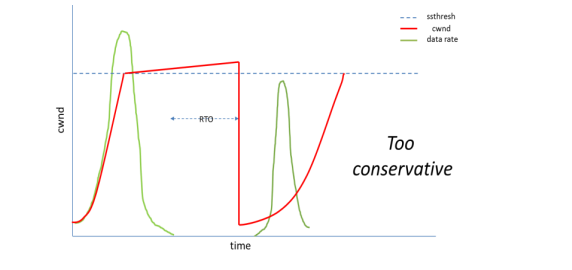 Standard TCP congestion control required that when an application is idle for a period greater than the Retransmission Timeout (RTO), the cwnd is reset to a small value. So, the next burst of data requires the sender to re-enter the Slow Start phase from this small value. Several RTTs may be consumed before the previous sending rate is again achieved. This approach is too conservative, in that it fails to use available capacity. For a bursty application, this scenario is quite common where each burst is separated by an idle period. As a result, the application performance suffers from this conservative behavior of TCP.