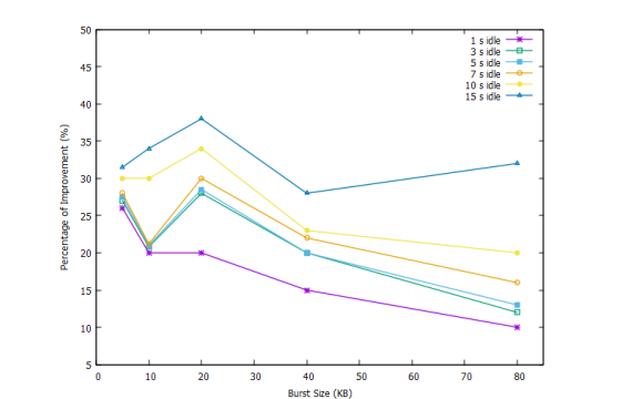 While in the previous scenario, there was no other traffic, the performance improved more for higher burst sizes. However, in this congested scenario, the trend is somewhat the opposite: Higher burst sizes offer less improvement. In the case of the idle period comparison, the similarity remains, where a larger idle period increases the improvement as in the previous noncongested scenario.