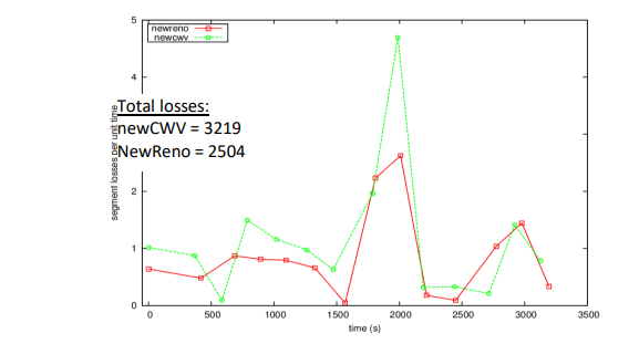 Figure 9. Loss plot comparing New Reno and newCWV; newCWV suffers more loss on average than standard TCP .