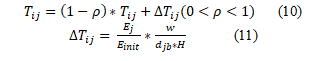 The Equation(10) and Equation (11) are the pheromone updating formula. The ρ indicates the pheromone evaporation rate and ΔTij indicates the pheromone secreted rate in the route of node i to j respectively. The pheromone evaporation rate is updated as 0<ρ<1 which is used to control the high level of pheromone concentration. In this, H denotes the total number of intermediate nodes through which node i has traversed. The distance between the candidate node j and the target node b is given by d_jb. E_j and E_init indicate the energy of node j and remaining energy ratio respectively.