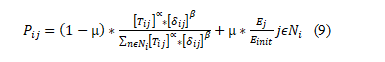 where, Pij represents the probability selection of next hop node from i to j. Tij represents the pheromone concentration value in the path of i and j.δij indicates the heuristic energy of the route. ∑(〖nϵN〗_i)▒[T_ij ]^∝ is the pheromone level of between current node and the neighbour node in the path and ∑(〖nϵN〗_i)▒[δ_ij ]^β denoted the reciprocal energy of the nodes. After that, µ is indicates the weight factor of energy of the node j. Therefore, α and βindicate the weight factors of pheromone and distance of the nodes in this equation. Eijand Einitindicate the balance energy of node j and the earliest energy of node j, respectively.