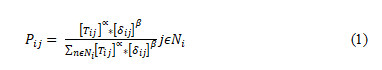 In all the available routes, high level of pheromone concentration is considered the best route during the route discovery process. The ACO algorithm followed the probability selection method which is expressed from zero to one. Here, zero indicates non-occurrence and one indicates the probability of occurrence. In ACO algorithm, the probability selection is used for an ant selecting the neighbour nodes which represent the next hop node and the hop count. Moreover, the following equation (Equation (1)) is used to compute the probability selection of next hop selection [7].