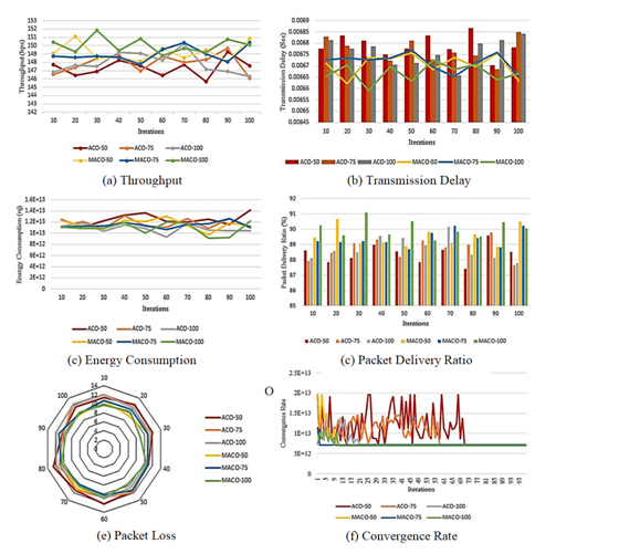 The comparative analysis of ACO and m-ACO algorithms is carried out by 100 numbers of iterations with various node density. In this validation, three different node density, namely, 50, 75, and 100 nodes are used. This study uses 100 number of iterations to evaluate the performance of algorithms in each iteration. Moreover, the average performance is also analysed in both algorithms based on the performance of each 10 iteration. The following sections describe the performance of both algorithms with different node density. In this evaluation, the network performance is analysed by various metrics such as throughput, packet loss, transmission delay, packet delivery ratio, energy consumption and convergence rate. The following figure 14 described the performance of ACO and m-ACO algorithm.