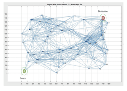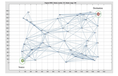 The following Figure 10 illustrates the experimental scenario with 50 number of nodes for this experimental analysis. In this scenario, the green color circles are represented in source and destination nodes. In this case, Node 1 is the source node, which is highlighted with green color, and node 2 is the destination which is represented with red color. Network transmission range represents the communication range of one node to another node and the range is 500 meters. A node communicates with the other node with more than 500 meters apart with the help of intermediate node. Therefore, intermediate nodes are indicated by blue color dots. Moreover, the X-axis and Y-axis represent the region of data communication.