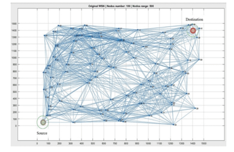 In this experimental analysis, there is randomly deployed three different node density on the targeted region, and the size of the region is 1500*1500 meters. For this analysis, 50,75 and 100 number of nodes are selected, and every node in this network is deployed at various individual places on the targeted region. Moreover, these nodes are interconnected wirelessly with 500 transmission range to create the connection between them. This study not only focuses on 500 meters, it is inclusive of 200 to 300 meters range. This range is used for the evaluation of the performance efficiency of this transmission range. Further, the experimental scenario is created using wireless network parameters to data transmission. Table 3 illustrates the parameters that create WSN scenarios.