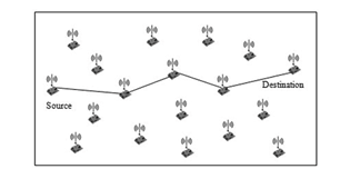 Figure 2. illustrates the multi-hop routing in WSN scenario. This network contains a source and destination node to transmit the data packets. In this scenario, line indicates the path between source to destination with the intermediate nodes. In this path, all the sensor nodes, except source and destination, are considered as intermediate nodes which help successful data transmission. In this case, the network takes four hops to reach the destination in wireless sensor network