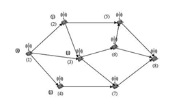 Example network scenario is created to explain the working process of ACO algorithm which is shown in Figure 3. This scenario totally contains eight nodes, and the nodes numbers is represented there. The node 1 (1) is the sender and node 8 (8) is the receiver node in the scenario. The purpose of this scenario is to select the optimum path in the meanwhile. Here, the i mentioned in equation 1 indicate the source node (Node (1)). Moreover, j indicates the neighbour nodes of i(Node (2), Node (3) and Node (4)) which is considered as next hop. In this case, node i chooses the following node j which is based on probability selection using equation 1. For example, if node3 is probably chosen as the next hop of node 1, it will change the position of i and j.