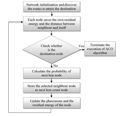 The ACO algorithm is a heuristic approach and it applied to multiple computational problems for finding the optimum solutions by graphs. In this algorithm, the artificial ant is categorized into two types, namely, forward and backward ants. These ants support to find optimum route to reach the target in WSN. Concurrently, each node maintains a unique routing table for storing information on the neighbour nodes. They are, distance between node, neighbour node ID, nodes balance energy and the pheromone concentration of the path. Following that, this process will continue to occur till it reaches its destination.