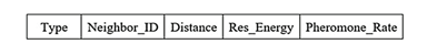 The following Figure 7 illustrates the table format of sensor node. It stores the neighbor node information in the route discovery process. Nodes ID is stored in ID and the neighbor nodes’ names stored in Neighbor ID format. Distance is represented by the distance between one node to neighbor nodes. The node’s residual energy is stored in Res_Energy column. Then the amount of pheromone contained in each path is stored in Pheromone_Rate7.
