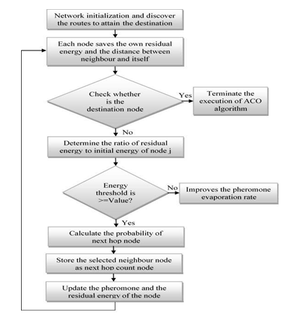 where, y indicates the present energy of the node j and the overall energy of the node set is denoted by ∑_(〖nϵN〗_i)▒E_n . Here, if node j has a higher remaining energy, it has more possibility to be chosen. Every artificial ant records the information about passed path in its memory. This information supports the ant in returning to the starting point along the same route and updating the pheromone level in the path. Pheromone evaporation is an important factor in ACO algorithm which is to avoid increasing pheromone concentrations on the path. If there is no evaporation, the paths chosen by the first ants would be overly appealing to the following ones. In this algorithm, the pheromone evaporation is used to avoid increasing the pheromone concentration rate. The pheromone evaporation rate is computed by Equation (4).