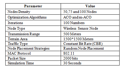 The experimental scenario is created to investigate the performance of ACO and m-ACO algorithms using WSN parameters. Moreover, the experimental scenario and the results are briefly discussed in the following section.