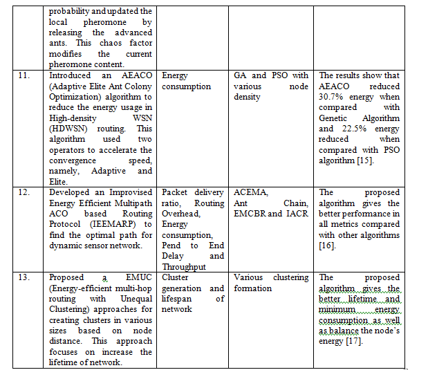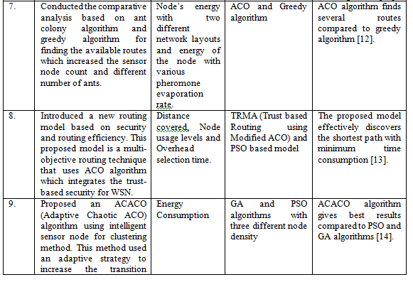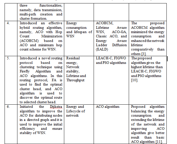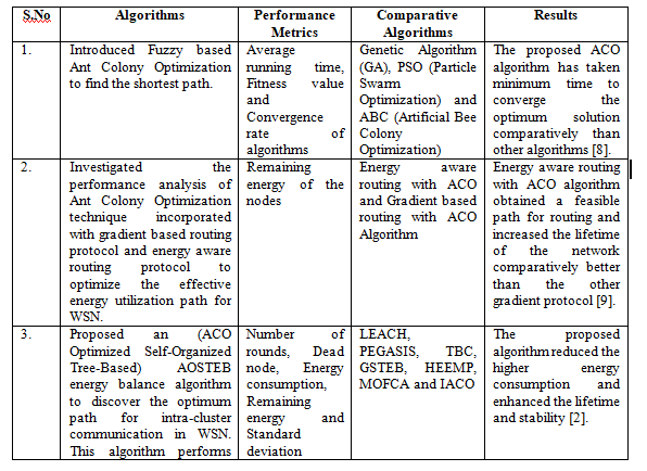 In this literature study, ACO algorithm was used to various routing problems to increase the network lifetime in WSN. Moreover, it was applied in different approaches, namely, fuzzy-based technique, routing mechanism, clustering methods, hybrid technique and optimization. In this investigation, the optimized and hybrid ACO algorithms give better performance when compared with ACO algorithm. However, sill some network problems are not completely solved in wireless sensor network. The results were taken in different performance metrics according to the problem. The next section briefly describes ACO and m-ACO algorithm and this comparison analysis.