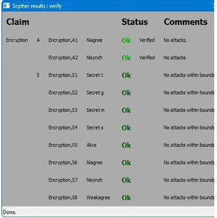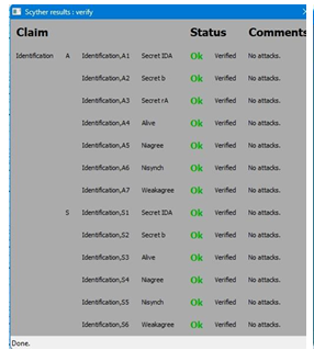 To exam and verify security protocols, an automated application called Scyther [21] is used. Each protocol entity in Scyther is referred to as a role, and claims are used to confirm the expected security objectives of each role. The definition of a claim is the claim (R, G, and P), which states that a role R expects the parameter P to meet the security objective G. The tool reports that a given claim is false if an attack is known to exist; otherwise, it returns that the claim is OK. The suggested procedure is validated using the claims listed below.