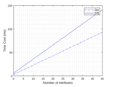 Fig. 6 focuses on the complexity of encryption on the DO side. As Fig. 6 shows, the time for encryption of DO increases linearly with the number of user attributes. Under the same conditions, the scheme in [19] takes the longest because it requires more EC multiplication point operations to be executed as the number of user attributes increases than our scheme. As a result, our scheme reduces the cost of computing on DO and DU significantly, increases the efficiency of encryption and decryption, and is appropriate for resource-constrained devices.
