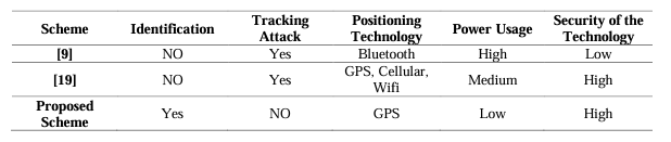 We compare each of the five aspects, which are the use of an identification scheme, immunity from tracking attacks, positioning technology, power usage, and security of the technology, with those in [9], and [19], as shown in Table 1.