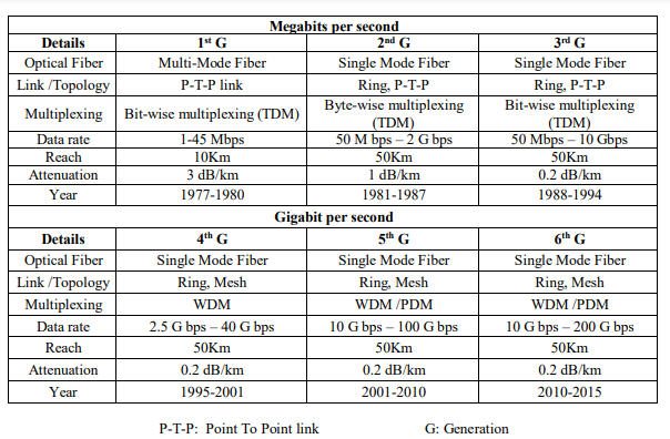 When optical fibers were first utilized for optical communications in 1977, the slope changed.The bit rate–distance product BL, where B is the bit rate and L is the repeater spacing, the distance after which an optical signal must be regenerated to maintain its fidelity, is a commonly used figure of merit for communication systems[19]. Table 1 indicate how technological advancements have raised from 1977 to 2015. The first generation of Optical Communication (OC) systems used GaAs semiconductor lasers with wavelengths of about 850 nm inside their optical transmitters. Before reaching an optical receiver, the optical bit-stream was transferred over graded-index multimode fibers and transformed to the electric domain using a silicon photodetector.System designers were motivated by the larger repeater spacing compared to the coaxial system’s 1 km spacing since it reduced the installation and maintenance expenses associated with each repeater. One can observe that attenuation gradually decreases from generation to generation which allows signals to travel for long distances without using the repeater.