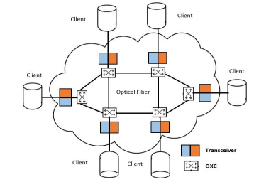 The fixed grid network is shown in Figure 2 it consists of a transceiver, Optical Cross-Connect (OXC), and optical fiber. Different clients are connected by using mesh topology in this example. It’s also possible to connect different clients with different topologies. An enhanced form of an optical network called a fixed grid optical network is made to deliver dependable, fast communication between numerous locations. They offer a practical method for developing an optical network without the use of pricey and complicated routing methods. Based on a mesh network architecture, fixed grid optical networks connect each node to several other nodes in a preset grid pattern. Each node in the network is directly connected to several other nodes, enabling effective communication between all of the nodes. High scalability, low latency, and dependable data transmission are benefits of employing a fixed-grid optical network. They are therefore perfect for services like streaming media, video conferencing, and long-distance communication.