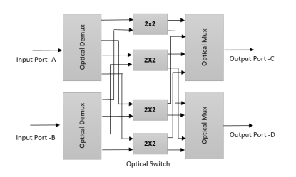 With the use of electronic cross-connection technology, optical data streams are first changed into electronic data in the digital OXC switch, which is then transformed back into optical data streams. OXC operates specifically in the photonic field[48]. Figure 7 illustrates the creation of an OXC in optical fiber communications using de-multiplexed and multiplexed WDM channels.