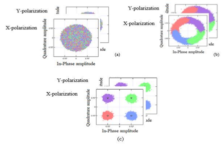 Figure 8. Constellation diagrams at various DSP component levels. (a) After dispersion compensation and right symbol clock for each polarization (b) After Polarization De-multiplexing and PMD compensation