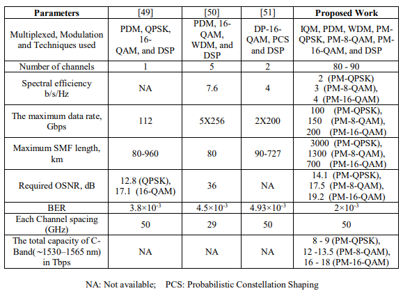 The gray-coded IQM-based optical modulation formats are performance compared in Table 5 using three research studies. It has been noted that employing single carrier transmission, the proposed designs exhibit a greater figure of merit, it primarily discusses bit rate and length. Although PDM-16-QAM has a higher data rate than the proposed architecture, the required OSNR is much higher