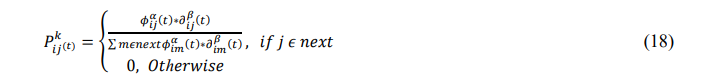 Here, πππ represents the link usage between πππ π‘π πππ , and πππ (π‘) represents the distance between πππ π‘π πππ in a reciprocal manner. πΌ, π½ are factors used for the link usage and inspiration factor. The unvisited nodes by PA are given by the factor “next”. Step 2: Calculate the distance travelled by the PA between the MNs using the equation (19). To minimize the traveling distance, we can utilize the product of π₯ππ β π¦ππ. πΏ(ππ) = βπ,πππππ πβ π π₯ππ β π¦ππΒ Β Β Β Β Β Β Β Β Β Β Β Β Β Β Β Β Β Β Β Β Β Β Β Β Β Β Β Β Β Β Β Β Β Β Β Β (19) In the above equation, π₯ππshows the distance between πππ π‘ππππ Where as π¦ππ is illustrated in the given equation (20). π¦ππ = { 1, ππ ππππ πππ‘π€πππ πππ π‘π πππ ππ π‘πππ£πππππ ππ¦ π β π‘ βπππππ‘ Step 3: The number of links between MN’s is counted using equation (21). The maximum number of iterations required to visit all nodes is determined by executing steps 1-4.