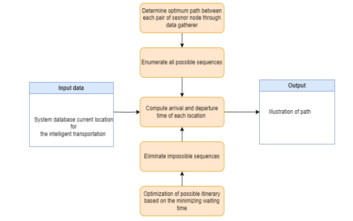 Figure 3. illustrate the itinerary planning model with data gatherer system that allows for the collection and analysis of data across a network. The data gatherer is used to collect and store data from numerous networked sources, including sensors, programs, and databases. Figure 4 shows the flowchart for illustrating the path using a system database and current location method, where the current location of an intelligent transportation system is given to compute the arrival and departure time of each location. For this, Firstly, we determine the optimal path between each pair of sensor nodes through the data gatherer, then we enumerate all possible sequences and eliminate the impossible ones. Secondly, we optimize the possible itinerary based on the minimum waiting time.