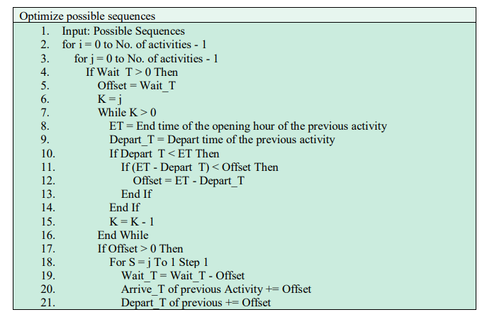 The pseudo-code representation of arrival and departure time computation and Optimization of possible sequences are illustrated as follows.