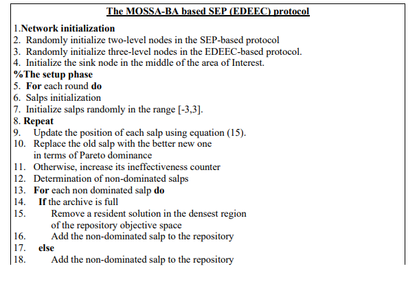 In this research, the selection of CHs during the initial phase of SEP or EDEEC has been investigated as a bi-objective optimization challenge. To simulate the process, the network is created with varying energy levels, similarly to SEP or EDEEC. In addition, MOSSA, MOSSABA, or MOPSO are utilized to optimize the CH set.