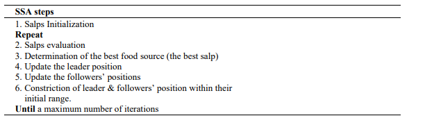 The Salp Swarm Algorithm (SSA) is an optimized technique that imitates the swimming behaviour of salps when looking for food sources in the ocean. In a spiral pattern, semi-translucent salps follow a leader salp to locate the most fitting food source [28]. Through this process, the leader guides the group of followers to locate the best food source.