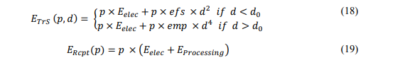 According to the radio energy model, each node loses energy 𝐸𝑇𝑟𝑆 (𝑝, 𝑑) for each packet transmission and loses 𝐸𝑅𝑐𝑝𝑡(𝑝)for each packet reception [26]: