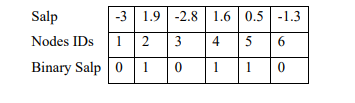 In this study, the network size, which is determined by the number of nodes, is used as the size of each salp (particle). To select the CHs (cluster heads) using multi-objective optimization methods, the salps are randomly initialized within the range of -3 to 3. Once initialized, the salps areconverted to binary, where only positive values are set to 1 and negative values are set to 0. This binary representation indicates which nodes are elected as CHs (with a value of 1) and which nodes belong to the nearest cluster (with a value of 0). The range of -3 to 3 is chosen to ensure that around half of the nodes are selected as CHs and to avoid having an empty set of CHs. An illustration of the adopted representation is below: