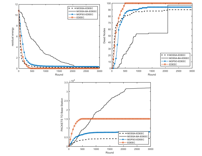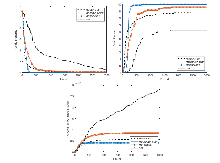 It is evident from the curves presented in Figures 3 to 5 that the MOSSA-BA algorithm outperforms the other algorithms in regards to conserving energy and the number of dead nodes per round.