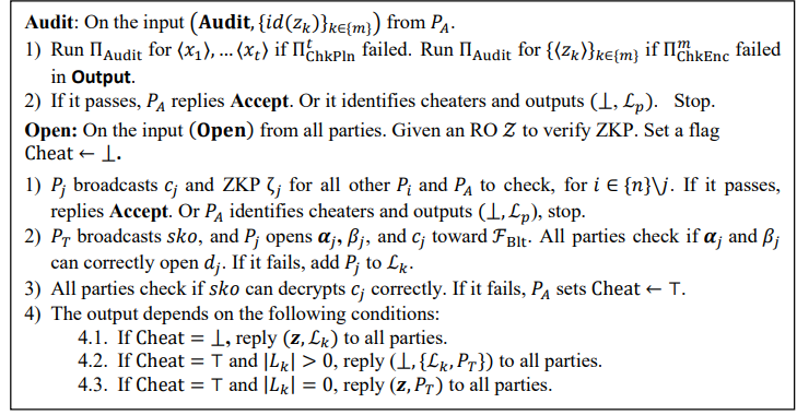 If ฮ ChkEncฯpasses, the encoded shares (๐ง๐(๐), ๐๐(๐)) are verified, and ๐ is ready to be recovered once the key ๐ถ is opened. If it returns Reject, we are not sure if the encoded shares are incorrect, some parties lied on the check outcome, or both happen, so in Audit ๐A needs to verify the expected commitments to find out the cause. The audit protocol is demonstrated by ฮ Audit in Figure 5. If the audit passes, the encoded shares are verified, the protocol still goes to output delivery. If both the check and audit fail, the encoded shares are considered incorrect, and the malicious parties that corrupt the output will be identified in the audit. The audit protocol can be accelerated by the technique in [3].
