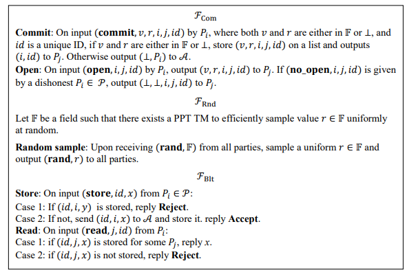 We assume a secure point-to-point network between all parties and a broadcast functionality. We also use the commitment functionality โฑCom, the random oracle โฑRnd for giving a random value over ๐ฝ to all parties, and the bulletin โฑBlt to handle all communication, such that nothing in the bulletin can ever be changed or erased. These functionalities are outlined in Figure 1.