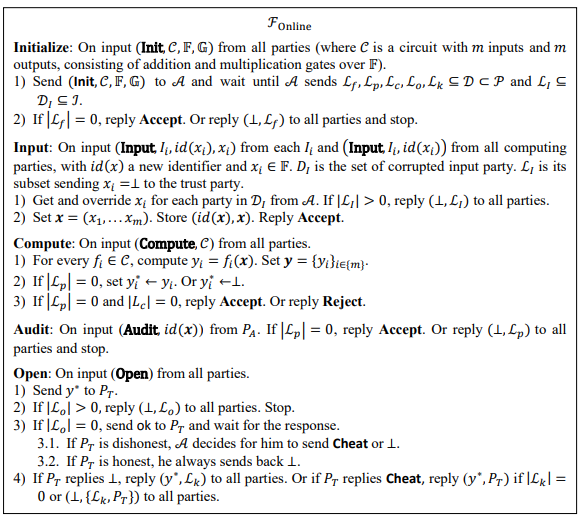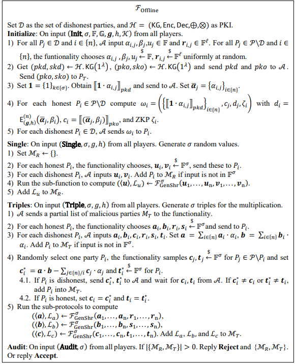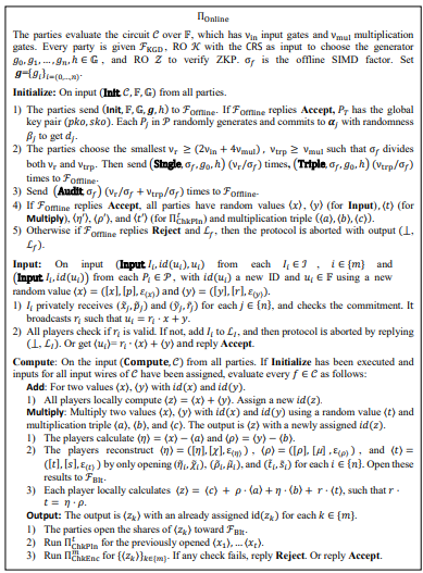 The online phase of our protocol uses โฑ Offline for offline preprocessing that is demonstrated in the full version of the paper. The commands of โฑOffline support single-instruction multiple-data (SIMD) processing with factors ฯ๐. Taking ๐ inputs, the circuit ๐ over ๐ฝ has ฮฝin input gates, ฮฝmul multiplication gates, and ๐ output gates, with ๐ โค ๐, the number of computing parties. The online phase is presented in Figure 2 and Figure 3, which evaluates the circuit ๐ of ๐ input gates and m output gates. The stages Input and Compute are executed for each input and function gate of ๐, respectively, and Initialization, Audit, and Open are invoked only once per circuit.