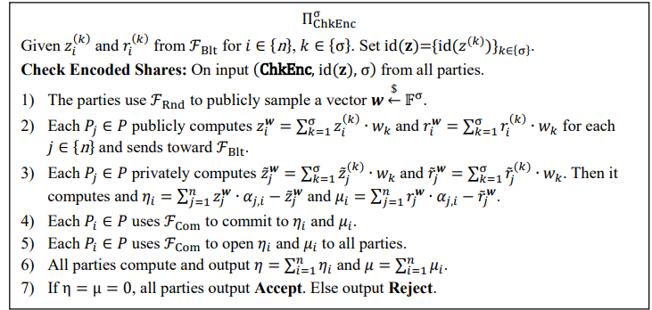 Figure 4. ฮ ChkEnc ฯ : Protocol for the correlation check of encoded shares