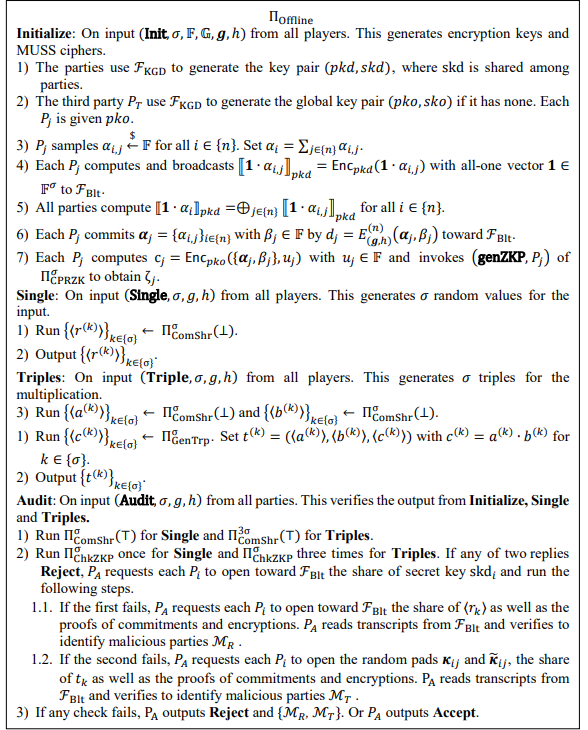 Initialization. The ideal functionality of the offline phase โฑOffline sets up the MUSS ciphers. The commitment scheme obtains the key from the random oracle ๐ฆ. The public-key infrastructure (PKI) is given by โ and will be elaborated in Sec. 3.3.1. The TTP publishes the global public key ๐๐๐. Each computing party ๐๐ privately keeps the additive shares ๐ผ๐,๐ for ๐ โ {๐}, where we set โ๐โ{๐} ๐ผ๐,๐๐ผ๐. With ๐ถฬ ๐ = {๐ผ๐,๐}๐โ{๐}, ๐๐ commits to ๐ถฬ ๐ toward โฑBlt by ๐๐ = ๐ค(๐,โ)(๐)(๐ถฬ ๐, ๐ฝ๐) and encrypts (๐ถฬ ๐, ๐ฝ๐) to have ๐๐ = โฆ(๐ถฬ ๐, ๐ฝ๐)โง๐๐๐ along with its ZKP ฮถ๐ to show the same plaintexts of ๐๐ and ๐๐ The generation and verification of ฮถ๐ will be provided in Sec. Error! Reference source not found.. Finally, the protocol asks the functionality โฑOffline to generate random values and multiplication triples. โฑOffline has its own check and audit for the output to ensure each player to have the correct share values as they committed to. If the misconduct is detected in โฑOffline, the malicious parties will be identified as ๐ฟ๐, and the protocol will be aborted.