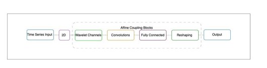 A sample configuration in [7] consisted of three affine coupling layers leveraging convolutional transformations, followed by a fully connected coupling node. A multiplexing Haar wavelets transformation layer was applied to split each channel into 4 channels, with half the width and half the height. The experiments studied various approaches [10][11][12][13][14] and were conducted on two different time series datasets: an ECG diagnostics dataset [15] and the predictive maintenance (PdM) Airbus helicopter accelerometer dataset [16].