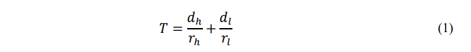 Consider two links, L1 and L2, operating at different rates within each other’s interference range. L1 operates at a high rate, rh, while L2 operates at a low rate, rl. Both links have saturated traffic demand and transmit a certain amount of data dhanddl, respectively. If we consider the period of time during which they can share the medium, then the total number of transmitted packets this time is: