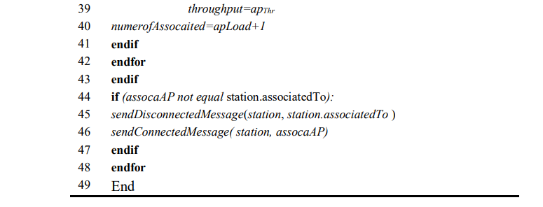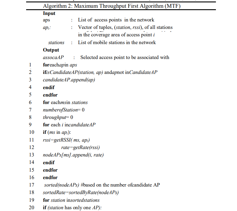 Next, the MTF algorithm computes the actual throughput for each AP in the candidate AP list for each station in the sorted Rate list using algorithm 4.1(Lines 27–43). Finally, the algorithm selects the access point with the highest throughput value as the best-associated access point and sends an association message to the selected access points(Lines 43–47).