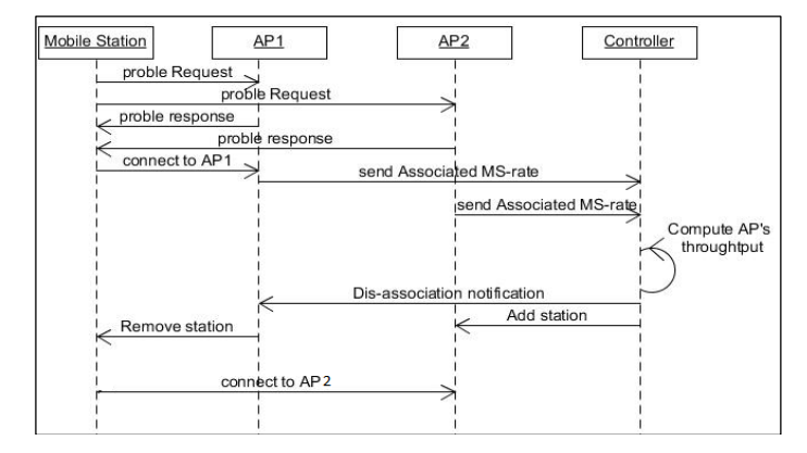 When a new station is within the coverage area of two or more access points and needs to associate with one of them, it broadcasts a request message and then waits for a probe-replay message from the selected access point. Once the corresponding access points receive the request probe message, they respond by sending a replay message to the controller, which includes information about MS and RSSI.