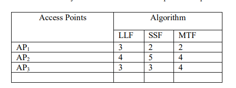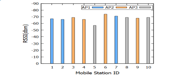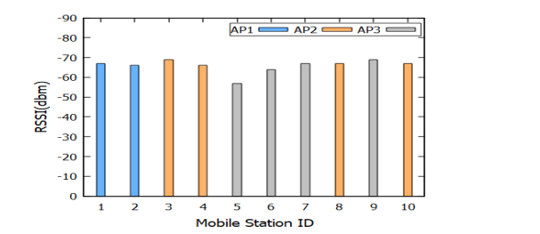 Let’s define the set of available access points in the network as aps = (ap1, ap2, ap3…apn). The vector of tuples api = [(MSj,RSSI) can be used to represent the statistical information for an access point 𝑖 ∈ 𝑎𝑝𝑠, where MSj is a mobile station with id j and RSSIis the signal strength between access point i and mobile stationj. The algorithm can obtain the transmission rate of each station in the AP’s list based on its RSSI value, as described in the IEEE a/g standard.