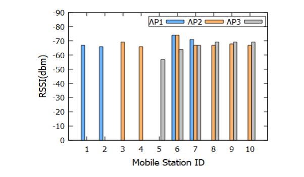 At the initial condition, in all three mechanisms, all mobile stations 1, 2, 3, 4, and 5 would attach to AP1, AP2, and AP3, respectively, due to only one access point available in their coverage area. The SSF association result for each station in the overlapped area is shown in Figure 8. It is evident from comparing it to the potential RSSI values displayed in Figure 6 that all overlapping stations will connect to the AP with the strongest signal. As a result, mobile stations 7, 9, and 10 are connected with AP2, while stations 6 and 8 are connected with AP3.