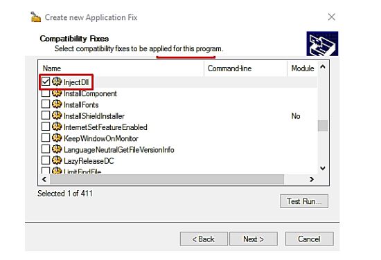 Now compatibility fix which is required to be applied to the executable is done. This research chooses the ‘InjectDll’ option from the list as shown in Figure 9. After checking the box, the ‘Parameters’ button provides the path of our malicious DLL that had been created at the start of the exploitation.‘Parameters’ button provides the path of our malicious DLL that had been created at the start of the exploitation.