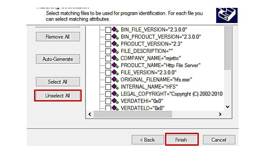 On the config window, the Matching Information panel is clicked for the ‘Unselect All’ Button as no additional configurations are required to out payload, and click the Finish Button as illustrated in Figure 11.
