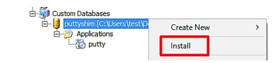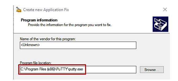 Now the process starts for binding the safe and original binary without malicious DLL file. On the newly created Database – right click to choose the First option in the Dropdown Menu called Create New. This leads to opening a sub-drop-down menu. Application Fix option is chosen and the Config Window Titled ‘Create New Application Fix’ is obtained. For this research, the authors used the name of the Program to be fixed as ‘putty’ as shown in Figure 7 and the path of the executable to the program to inject the malicious DLL into.